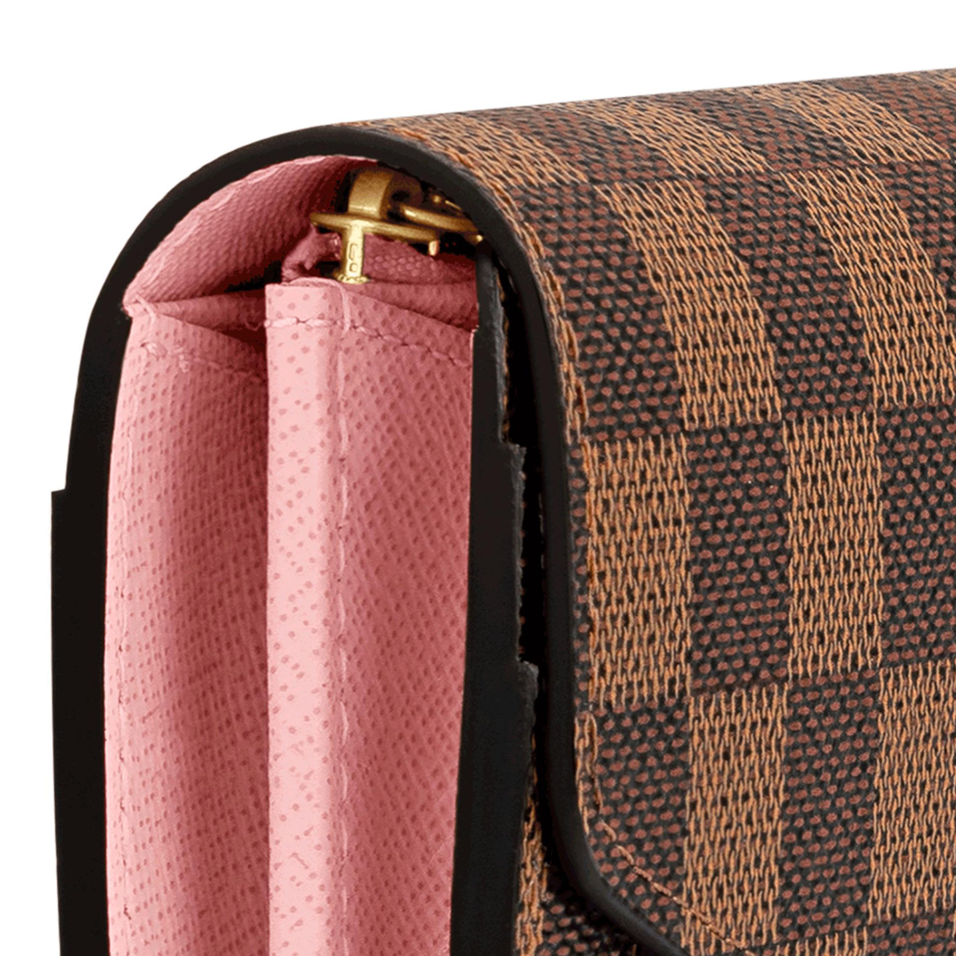 の伝統的なダミエ・キャンバスにグレインレザーのライニングを合わせたポルトフォイユ・サラ」。2つの充分な容量のコンパートメント、ファスナー付きコインポケット、複数のカードスロットを備えた機能性と、フェミニンな印象を併せ持つ定番アイテムです。エンヴェロップ型のフラップには、刻印を施したゴールドカラーのスナップをあしらいました。
