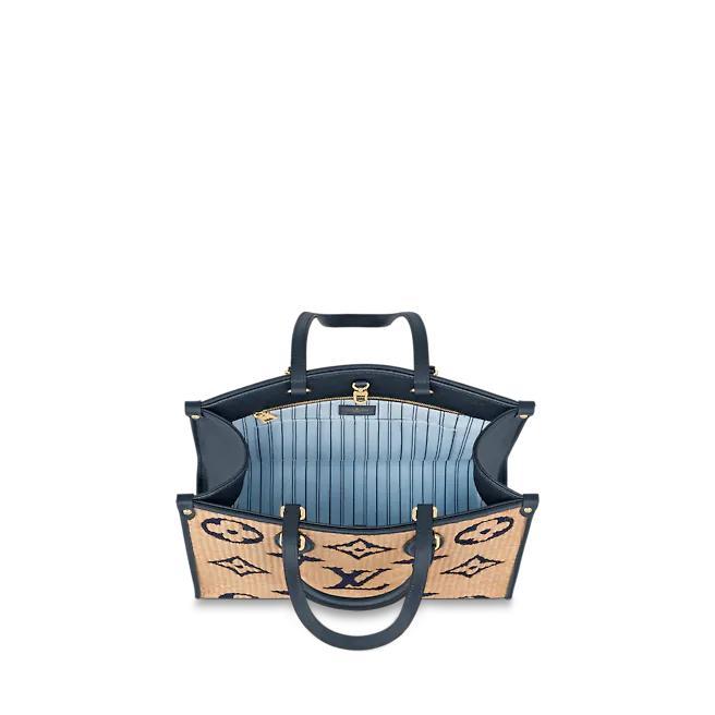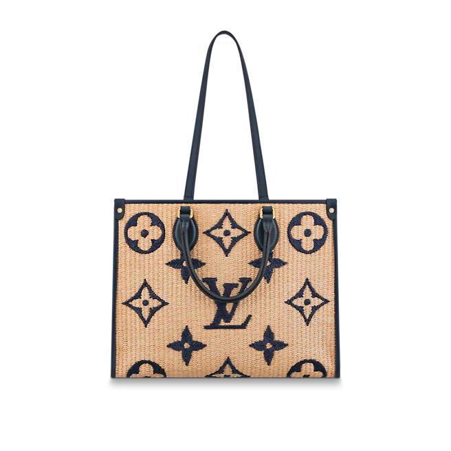 モノグラム・ラフィア テキスタイルを使用し、レザーハンドル、ショルダーストラップ、マチ付きで仕上げた「オンザゴー MM」。旅行やビーチに最適なバッグです。リサイクルされたコットンと持続可能な方法で調達されたビスコースを組み合わせたモノグラム・ラフィアに、モノグラム・ジャイアント パターンの刺繍をあしらいました。取外し可能なコントラストカラーのバッグチャームが彩りを添えます。