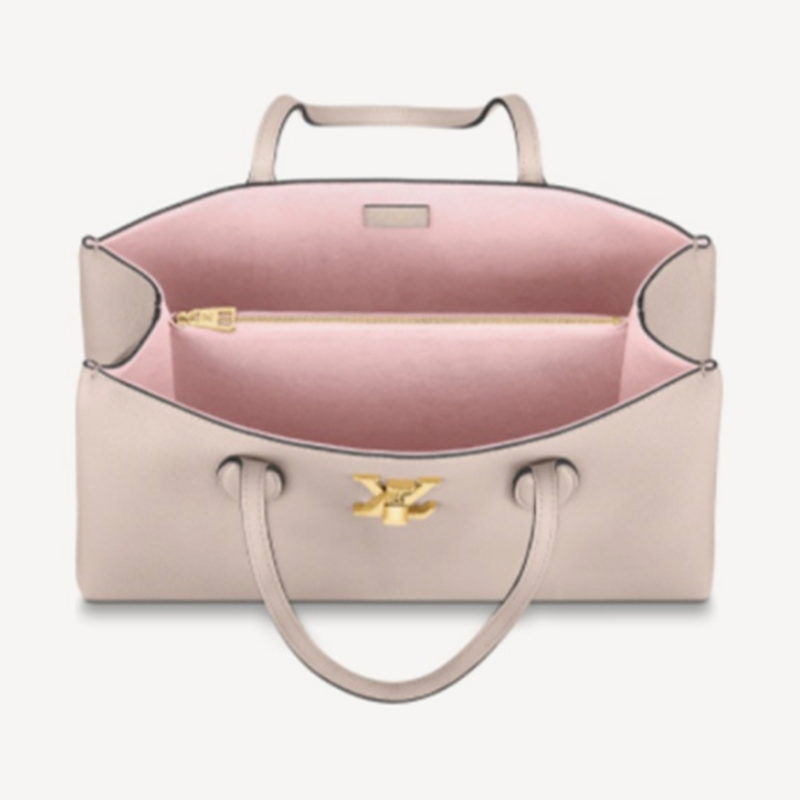 2本のロングレザーストラップで快適に持ち運べる「ロックミー・ショッパー」。しなやかなカーフレザーにあしらわれたアイコニックなLV ターンロックで、しっかりと中身を保護できるのが魅力です。折り畳まれ、丸みを帯びたマチが、フェミニンな印象を演出するとともに、A4のファイルなど身の回りの必需品を収納できる大容量を実現します。