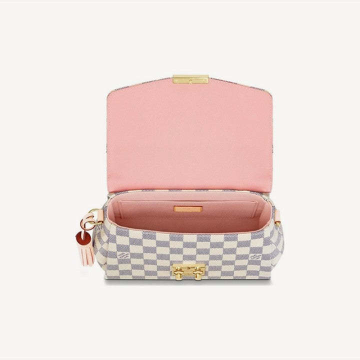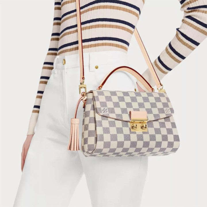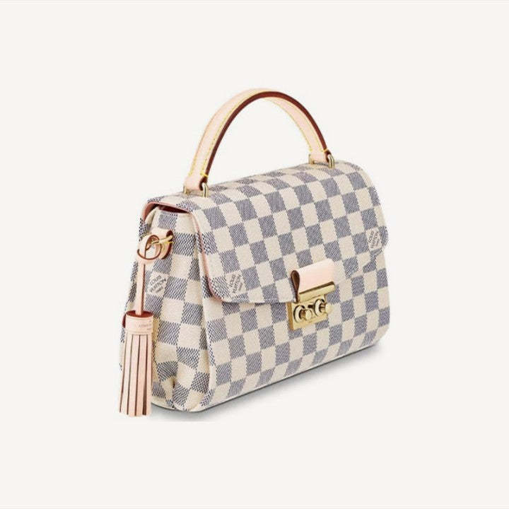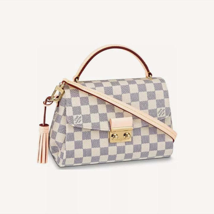 モダンなラインのコンパクトなバッグ、夏らしいダミエ・アズールキャンバスのクロワゼットは、洗練されたディテール(シグネチャーSロックに注意してください)とカジュアルでシックな魅力を誇っています。取り外し可能な革のタッセルは、楽しみのタッチを追加します。必需品と長い財布に合うようにサイズで、この多目的な作品は、手持ち運んだり、肩に掛けたり、クロスボディを着用したりすることができます。