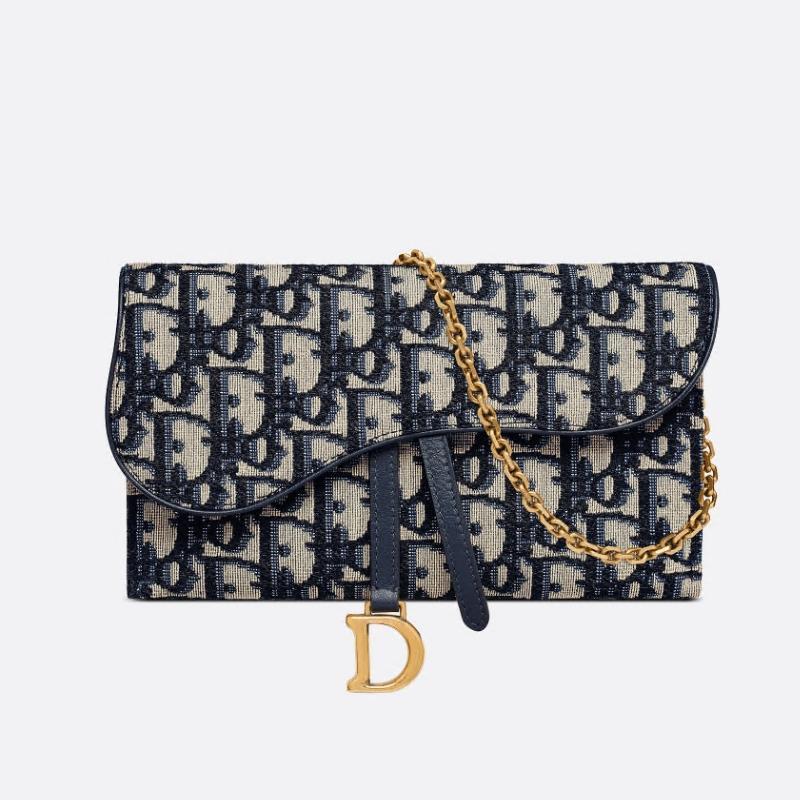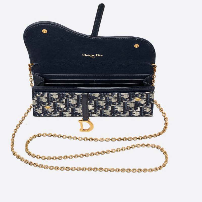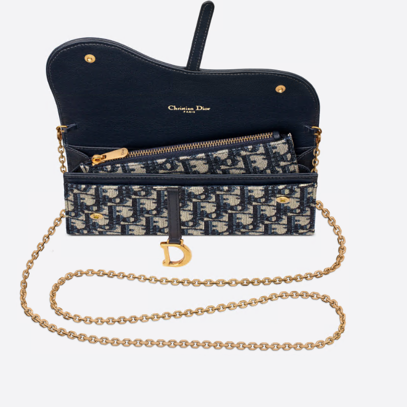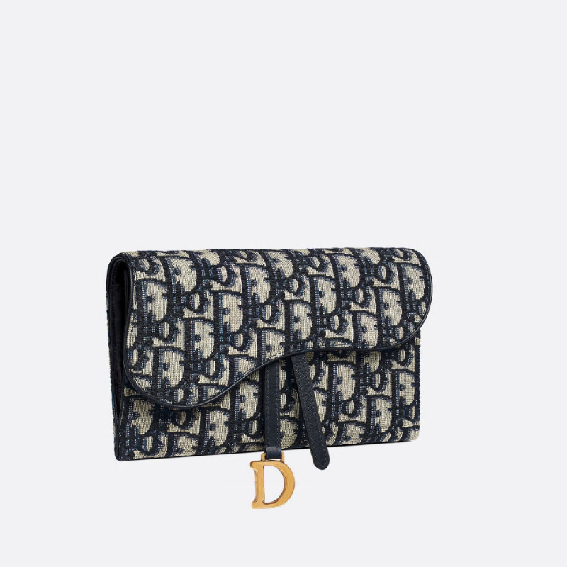 ブルーの「ディオール オブリーク」ジャカードを使用した「サドル」ウォレットは、モダンですっきりとしたデザインのハイブリッドアイテム。アシンメトリーデザインのフラップに、あぶみを象ったアンティークゴールドトーン メタルの“D”型モチーフをあしらいました。取り外し可能なストラップが付いているので、ハンドバッグとしてはもちろん、ショルダーバッグやクロスボディバッグとしてもお使いいただけます。