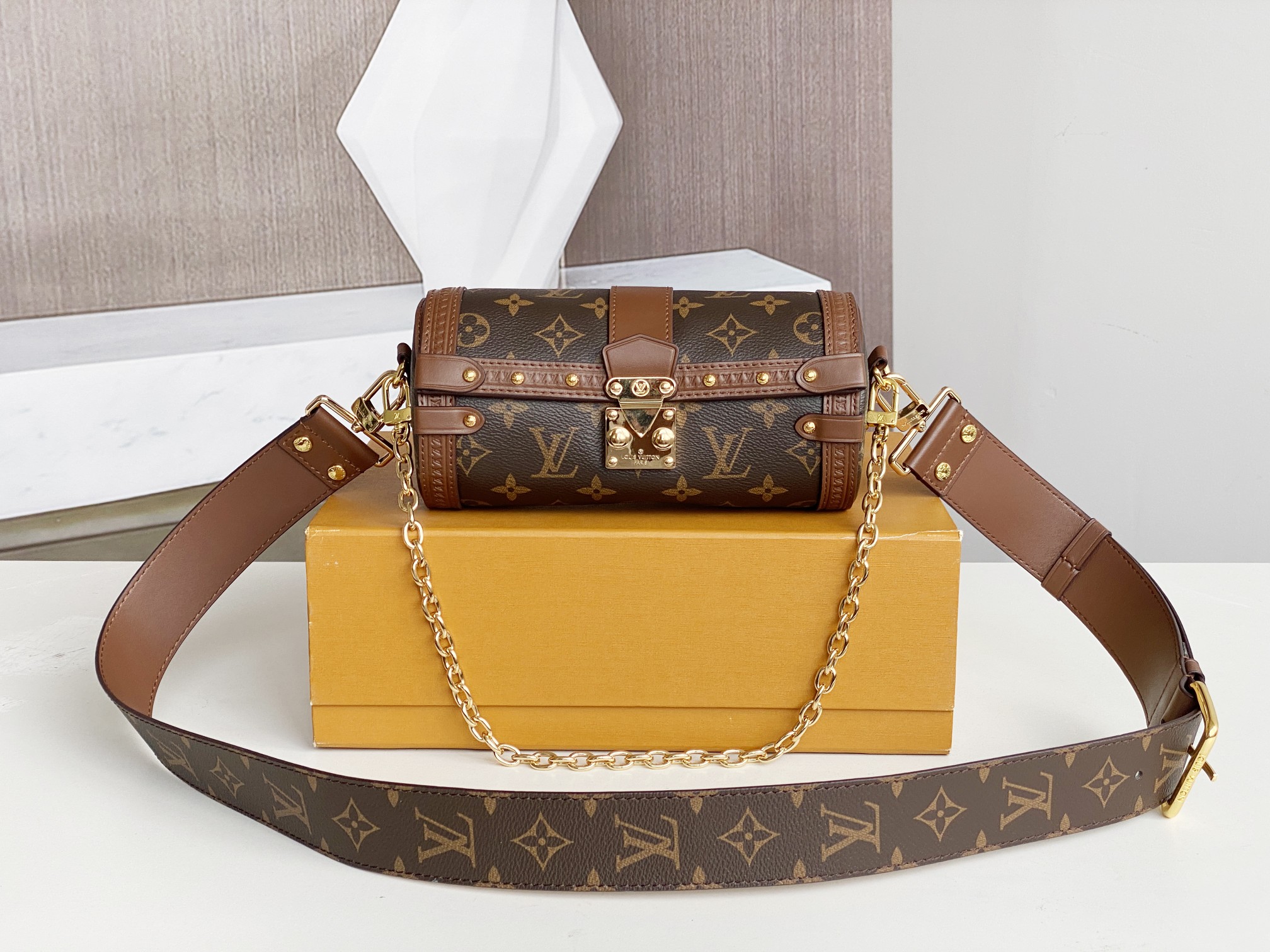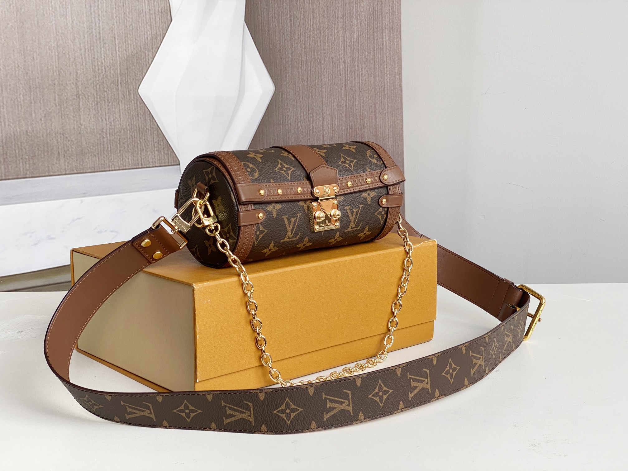 ルイ・ヴィトンのアーカイヴから着想を得て、ニコラ・ジェスキエールがフェミニンかつカジュアルな雰囲気にアップデートした「パピヨントランク」。アイコニックなボストン型のバッグ「パピヨン」を、トレンディなやや硬めの仕立てのバゲットバッグに仕上げました。Sロック、LV イニシャルをエンボス加工で並べたトランクのトリミングを想わせるディテール、スタッズなどで、メゾンが誇るトランク製造の歴史にオマージュを捧げています。