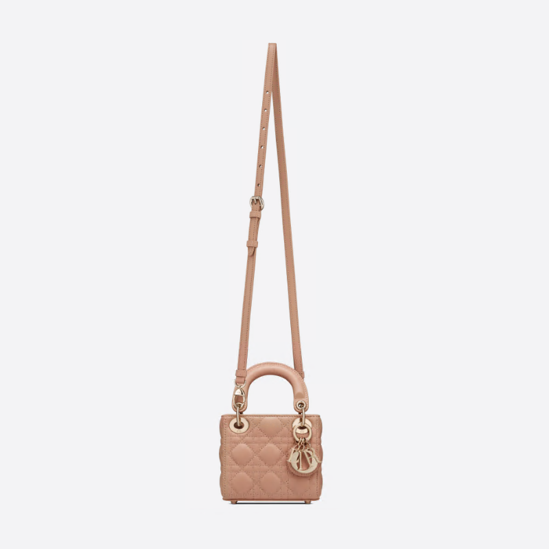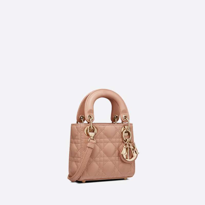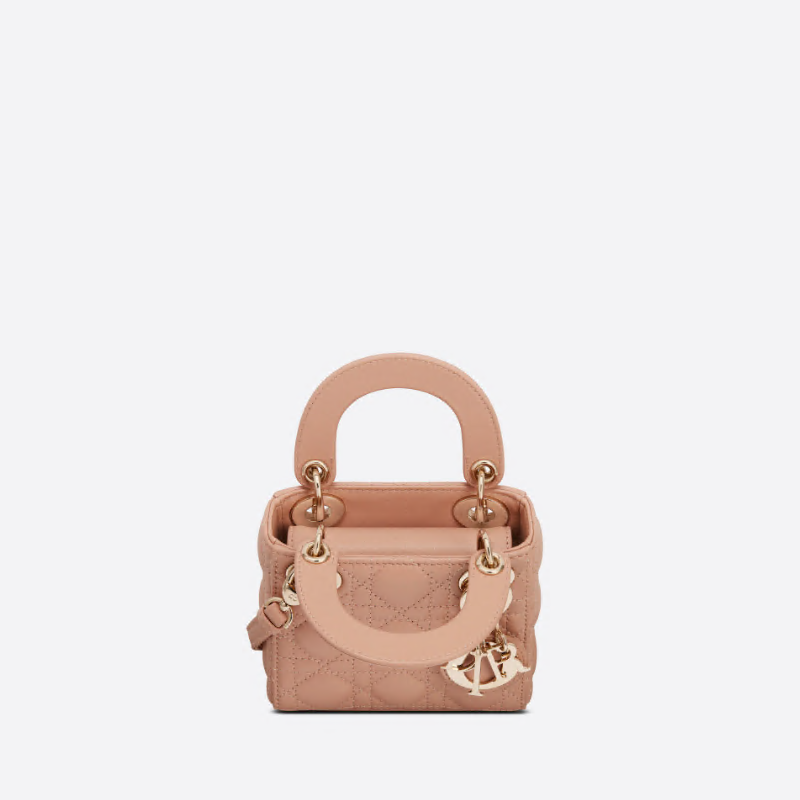 メゾンのビジョンである卓越性と美を体現する、マイクロ「レディ ディオール」バッグ。「Rose des Vents (ローズ デ ヴァン)」カラーの「カナージュ」ステッチ入りラムスキンを使用したアイコニックなシルエットに、“D.I.O.R.”チャームでアクセントをプラスしました。小物や必需品をまとめて収納できるミニサイズのこのバッグは、夜のお出かけの理想的なパートナーです。
