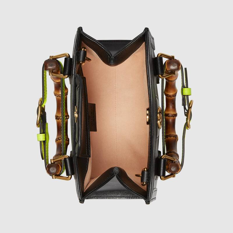 グッチを象徴するさまざまなエレメントを散りばめたミニ トートバッグ。バンブー ハンドルとダブルG ハードウェアがデザインのポイントです。ブラック レザーで仕立てたバッグに、ネオンカラーのストラップを2本配しました。ハンドルの形を保つためのバンドを模した、遊び心あるディテールです。
