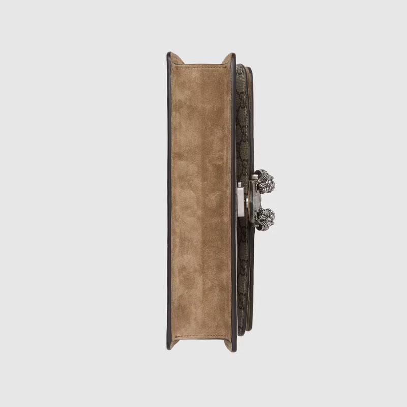 グッチを代表するGGパターンのキャンバスで仕立て、トープカラーのスエードでトリムを施した、小ぶりな〔ディオニュソス〕ショルダーバッグ。ラインを象徴するモチーフ、タイガーヘッドのクロージャーがフォルムを際立たせます。このモチーフはギリシャの神ディオニュソスをイメージしたもの。ゼウスから贈られたトラの背中にまたがり、チグリス川を渡ったという神話が伝わっています。ここではタイガーヘッドにきらめくクリスタルをあしらい、いっそう豪華な仕上がりに。スライド式のチェーンストラップにより、ショルダーバッグやクロスボディバッグ、さらにトップハンドルバッグとしてもお使いいただけます。
