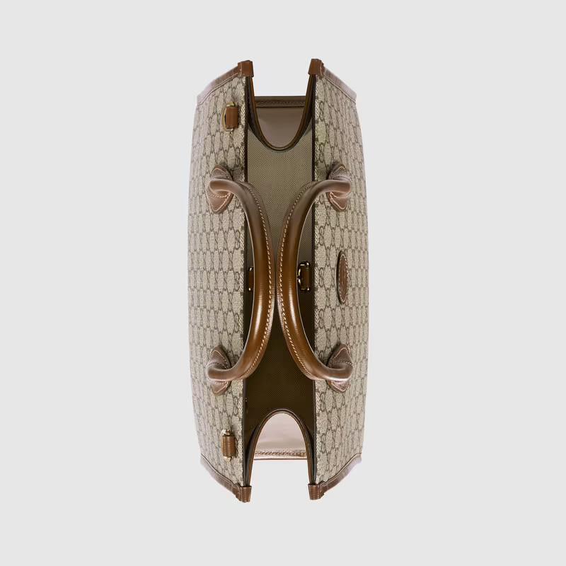 かっちりとしたシェイプのスモール トートバッグ。GGスプリーム キャンバスで仕立て、ブラウンのレザー トリムを施しました。トップハンドルとショルダーストラップを備えた、ダブルハンドルのデザインです。
