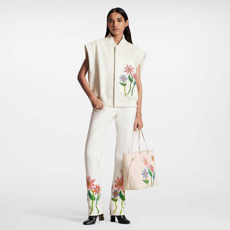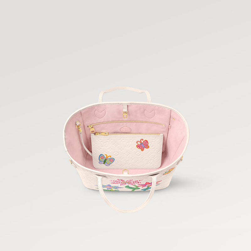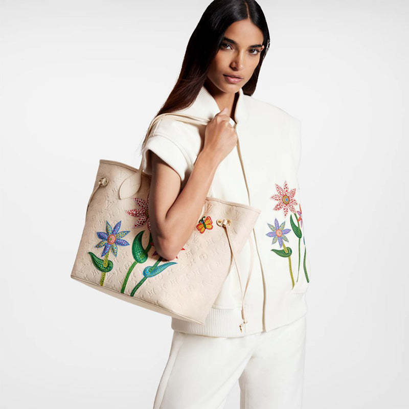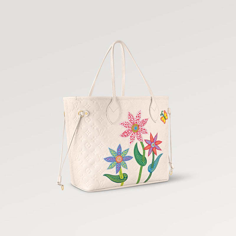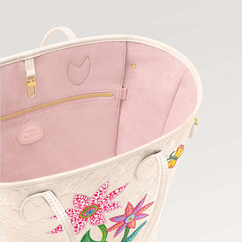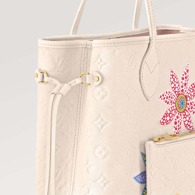 「ルイ・ヴィトン × 草間彌生」コレクションならではの「フラワー」のテーマで、フェミニンに仕上げた「LV × YK ネヴァーフル MM」。生家が種苗業を営んでいた草間彌生にとって幼少期から大切な存在であった花々は、後に彼女の作品の重要なテーマとなります。クオーツホワイトのモノグラム・アンプラント レザーにカラフルな3つの「フラワー」のモチーフをレザーのマルケトリ細工で描いた、使い心地の良いバッグです。アートとクラフツマンシップが薫る一品。