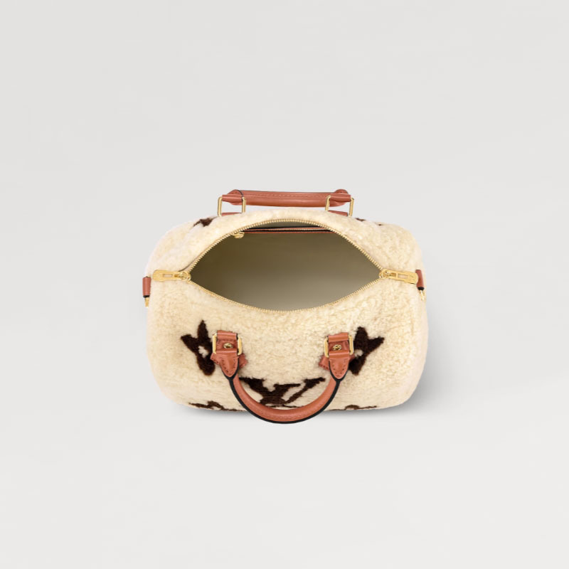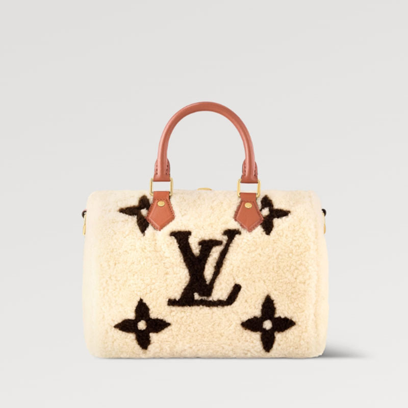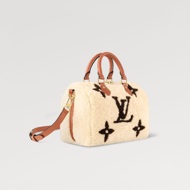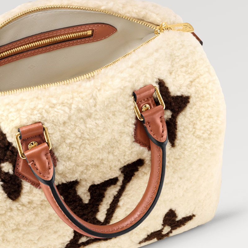柔らかなシアリングにグレインレザーのトリミングを施し、冬に相応しくアレンジした「スピーディ・バンドリエール 25」。洗練されたインターシャ(象嵌細工)技法を用いて異なる2色のシアリングで表現した、モノグラム・ジャイアント パターンが特徴です。2本のロール仕上げのレザーハンドルと、取外し & 調節可能なレザーのショルダーストラップで、さまざまな持ち方をお楽しみいただけます。
