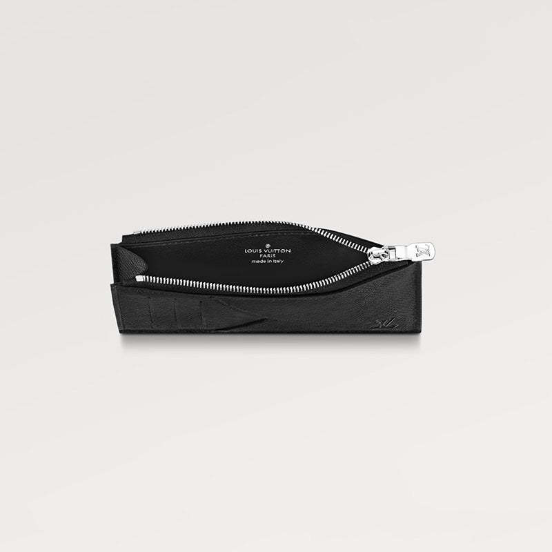 ルイ・ヴィトンのシグネチャーであるブラックのタイガ・レザーを使用した「コインカード・ホルダー」。支払いの際の必需品を1つにまとめて安全に収納できるすっきりとしたスリムなデザイン。複数のクレジットカード用スロット、紙幣用コンパートメントに、シルバーカラーの引き手が付いたファスナー式コインケースを備えています。