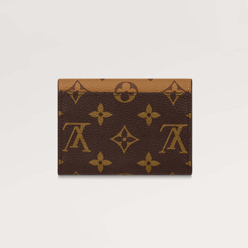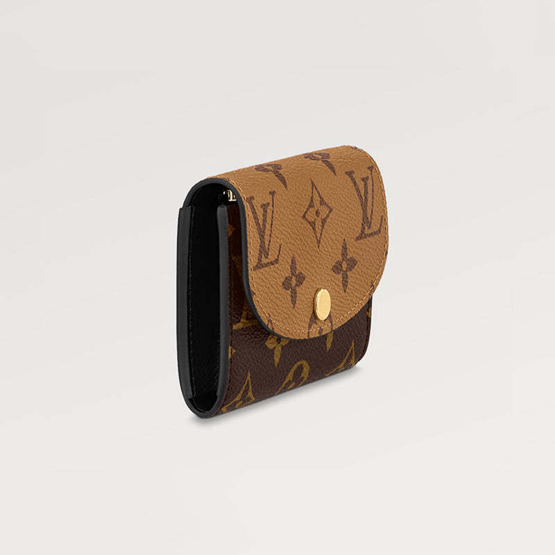 モノグラム & モノグラム・リバース キャンバスを組み合わせた、洗練された個性を放つ「ポルトモネ・ロザリ」。丸みを帯びたフラップに、刻印を施したゴールドカラーのスナップボタンをあしらった、小ぶりの財布です。内側にはフラットポケット、ファスナー付きコインポケット、2つのカードスロットを備え、背面にはフラットポケットが配されています。