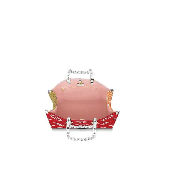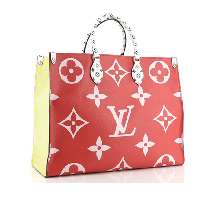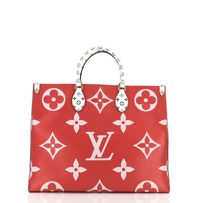 イヴィトン オンザゴー スクエア トートバッグ レッド モノグラム ジャイアント 充分な収納力を備えたバッグにオーバーサイズのモノグラムパターンをあしらい、ミニモノグラムのトリミングでコントラストを。