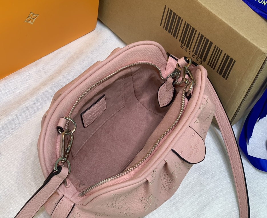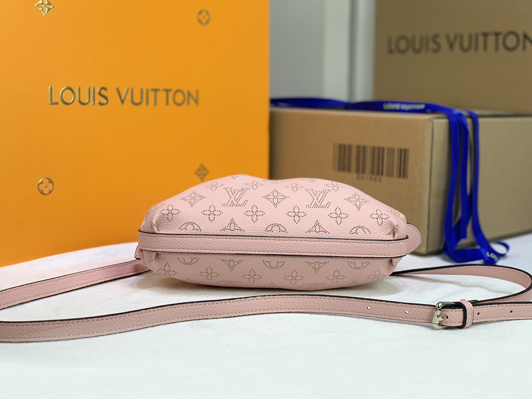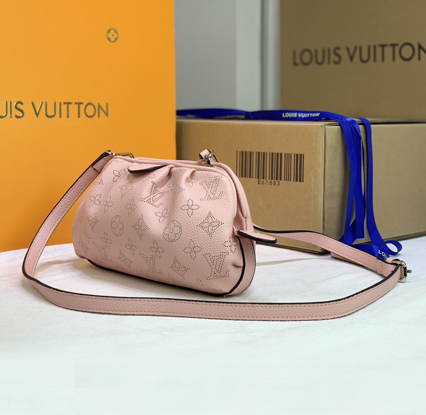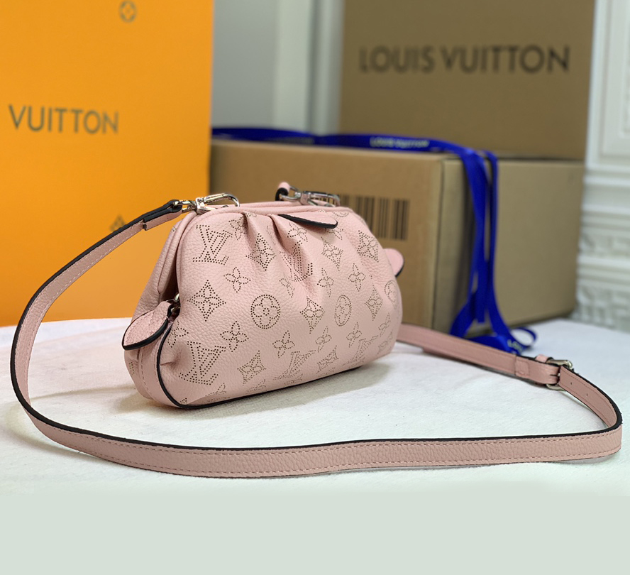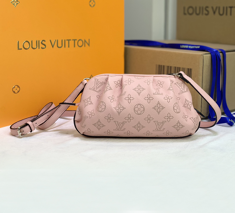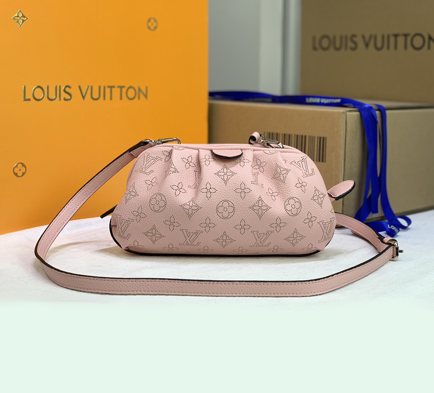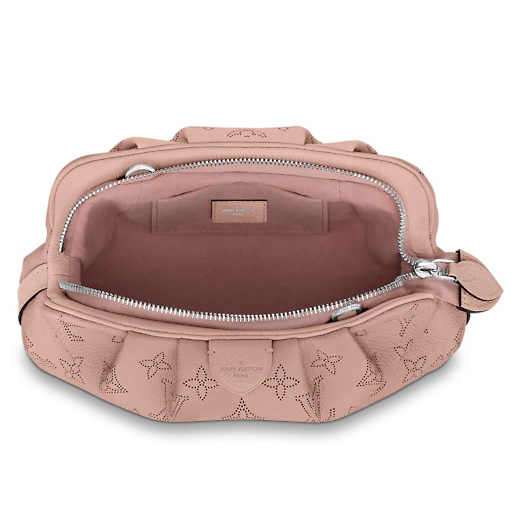 ドレーパリーの折り目やプリーツから着想を得て、柔らかでボディフレンドリーなシェイプに仕上げた「スカラ・ミニ」。アイコニックなモノグラム・パターンをパーフォレーションで施した、しなやかなマヒナ・レザーが魅力です。身の回りの必需品を持ち運ぶのに充分な容量を備え、取外し & 調節可能なストラップ付きでさまざまな持ち方をお楽しみいただけます。