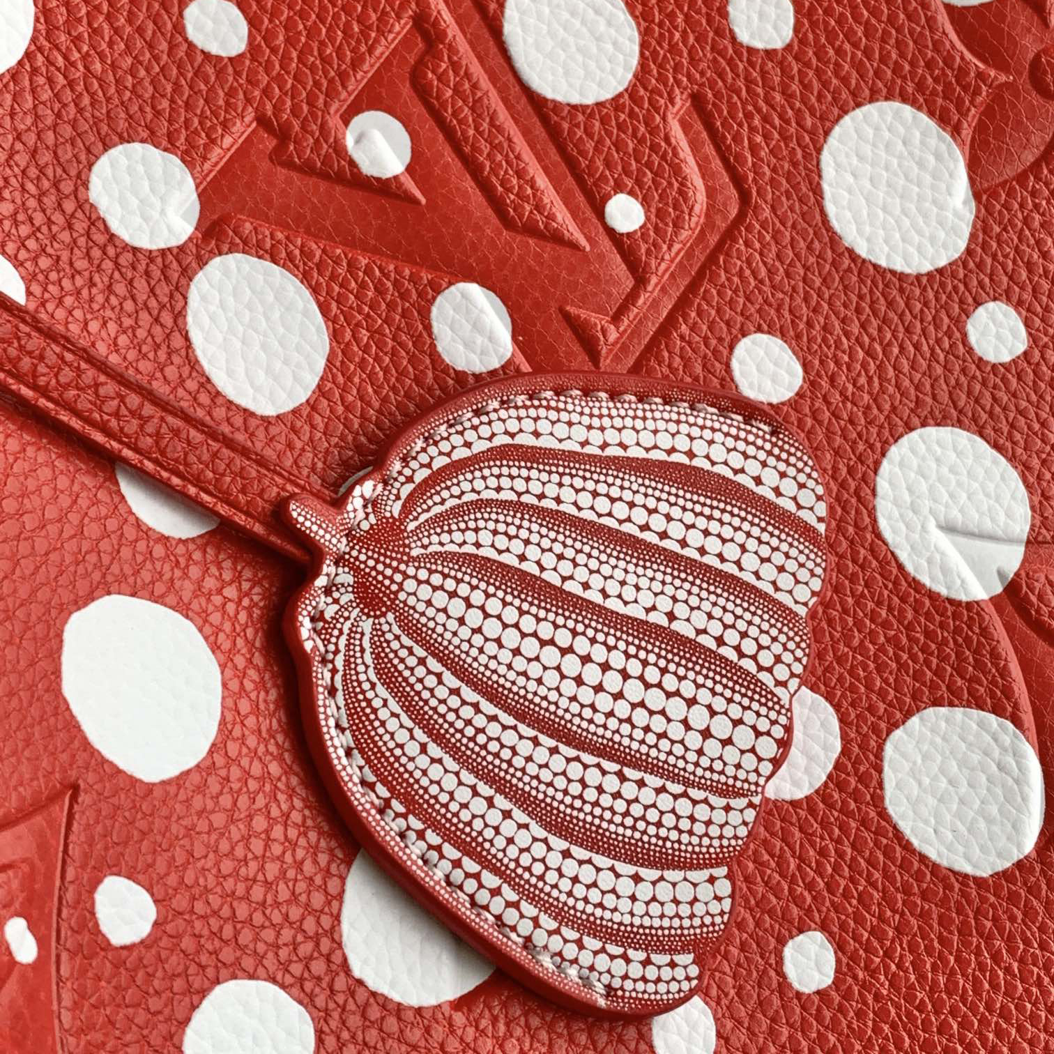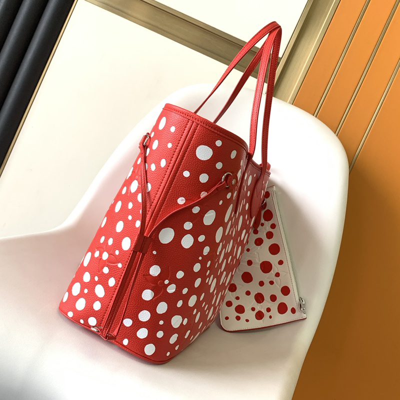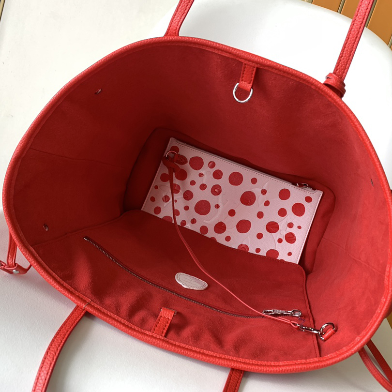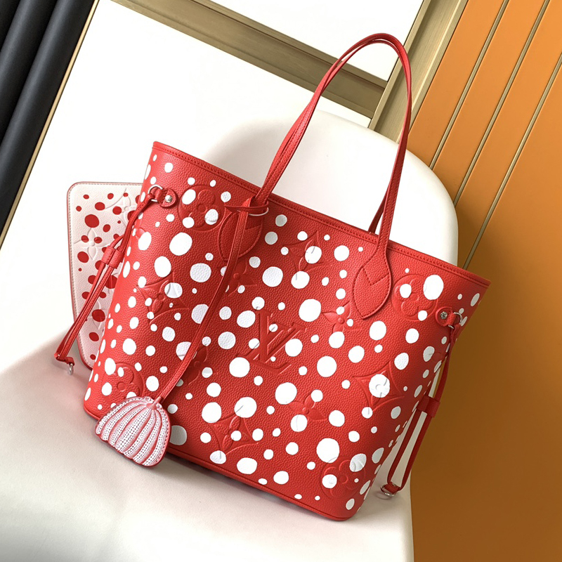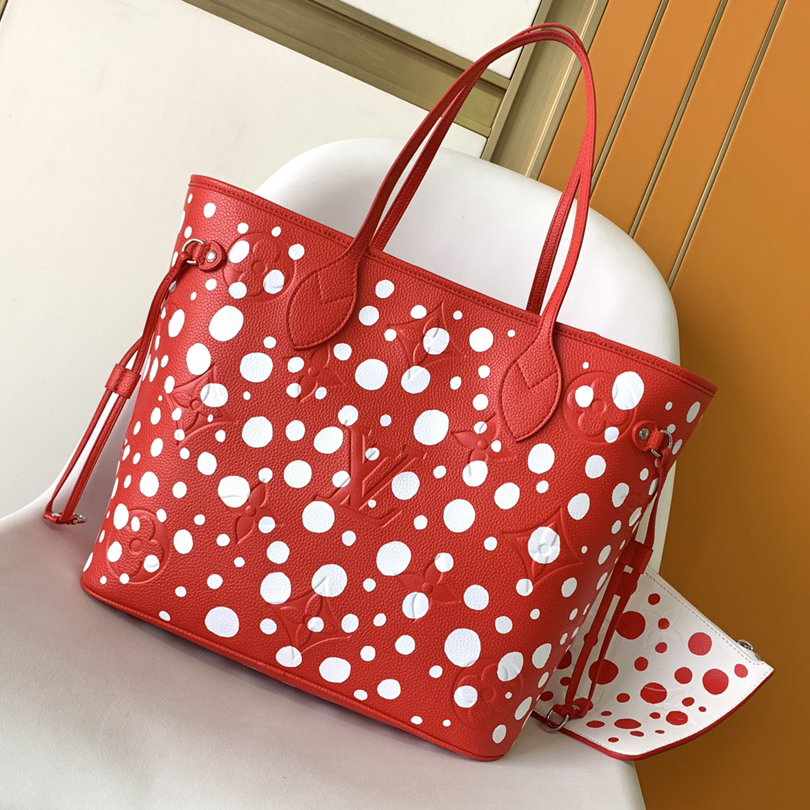 アートと上質なクラフツマンシップを讃える、「ルイ・ヴィトン × 草間彌生」コラボレーションの新作コレクションに相応しい「ネヴァーフル MM」。著名な日本人アーティスト 草間彌生は、無限を想わせるシンボルとして水玉模様を用いることで知られています。艶やかなレッドのモノグラム・アンプラント レザーに、ホワイトのドットをあしらいました。草間のもう1つのシグネチャーであるパンプキンを象ったチャームで彩り、取外し可能なポーチを配して機能性を高めたトートバッグです。