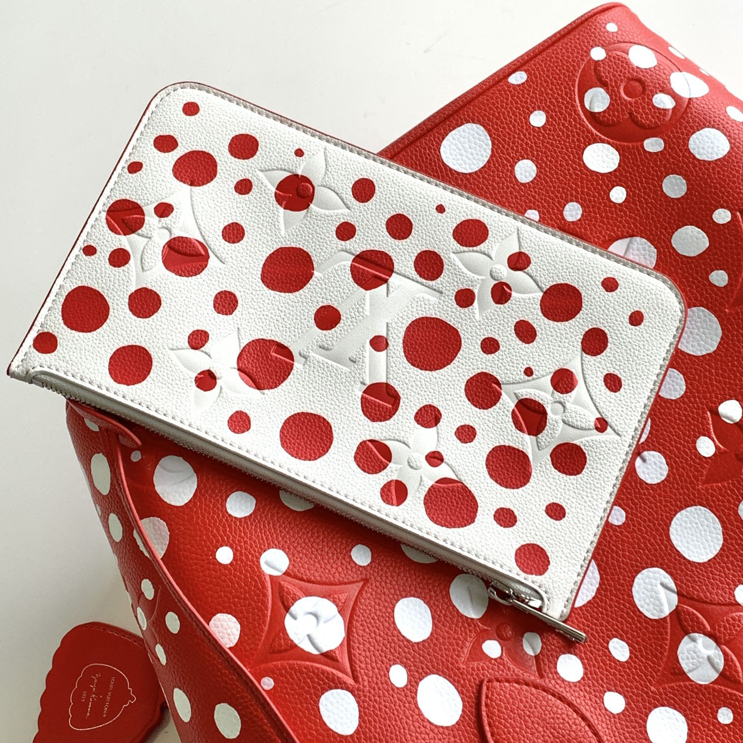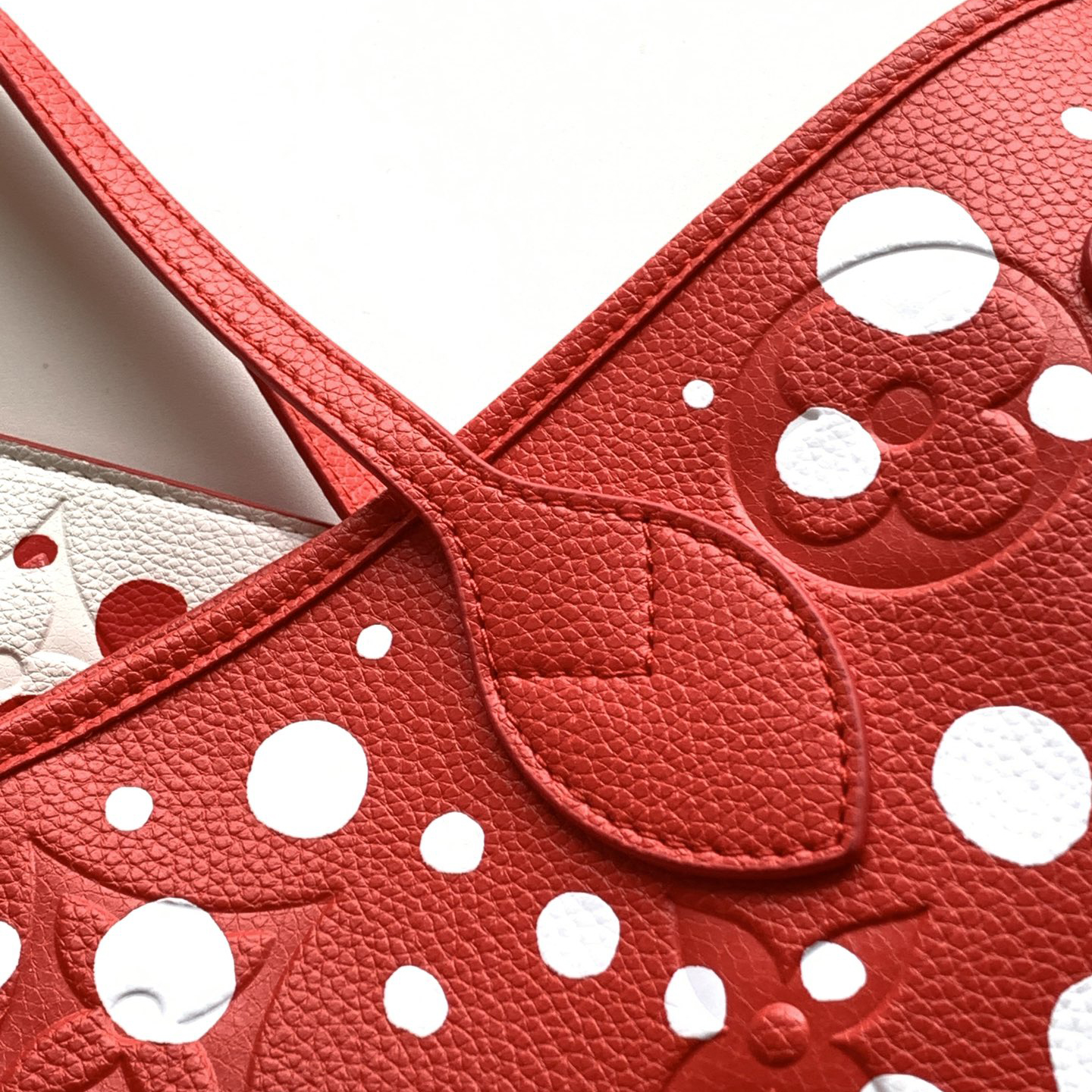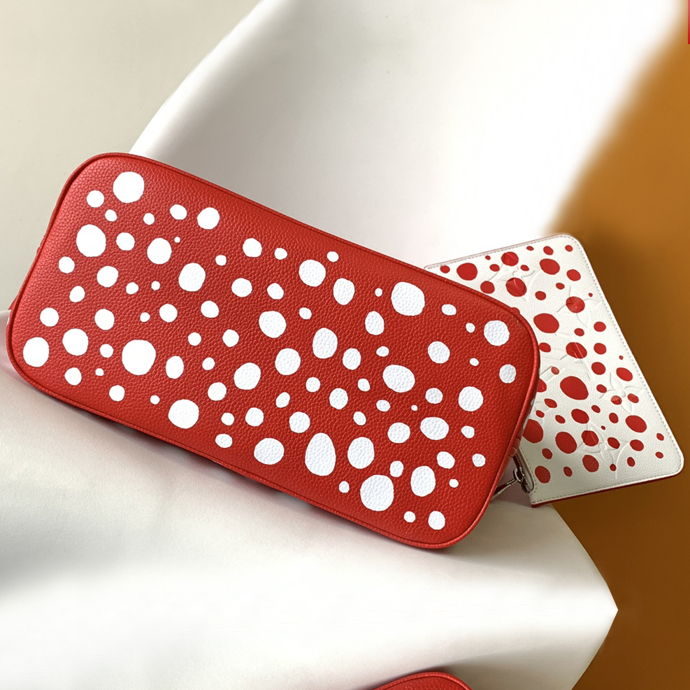 アートと上質なクラフツマンシップを讃える、「ルイ・ヴィトン × 草間彌生」コラボレーションの新作コレクションに相応しい「ネヴァーフル MM」。著名な日本人アーティスト 草間彌生は、無限を想わせるシンボルとして水玉模様を用いることで知られています。艶やかなレッドのモノグラム・アンプラント レザーに、ホワイトのドットをあしらいました。草間のもう1つのシグネチャーであるパンプキンを象ったチャームで彩り、取外し可能なポーチを配して機能性を高めたトートバッグです。