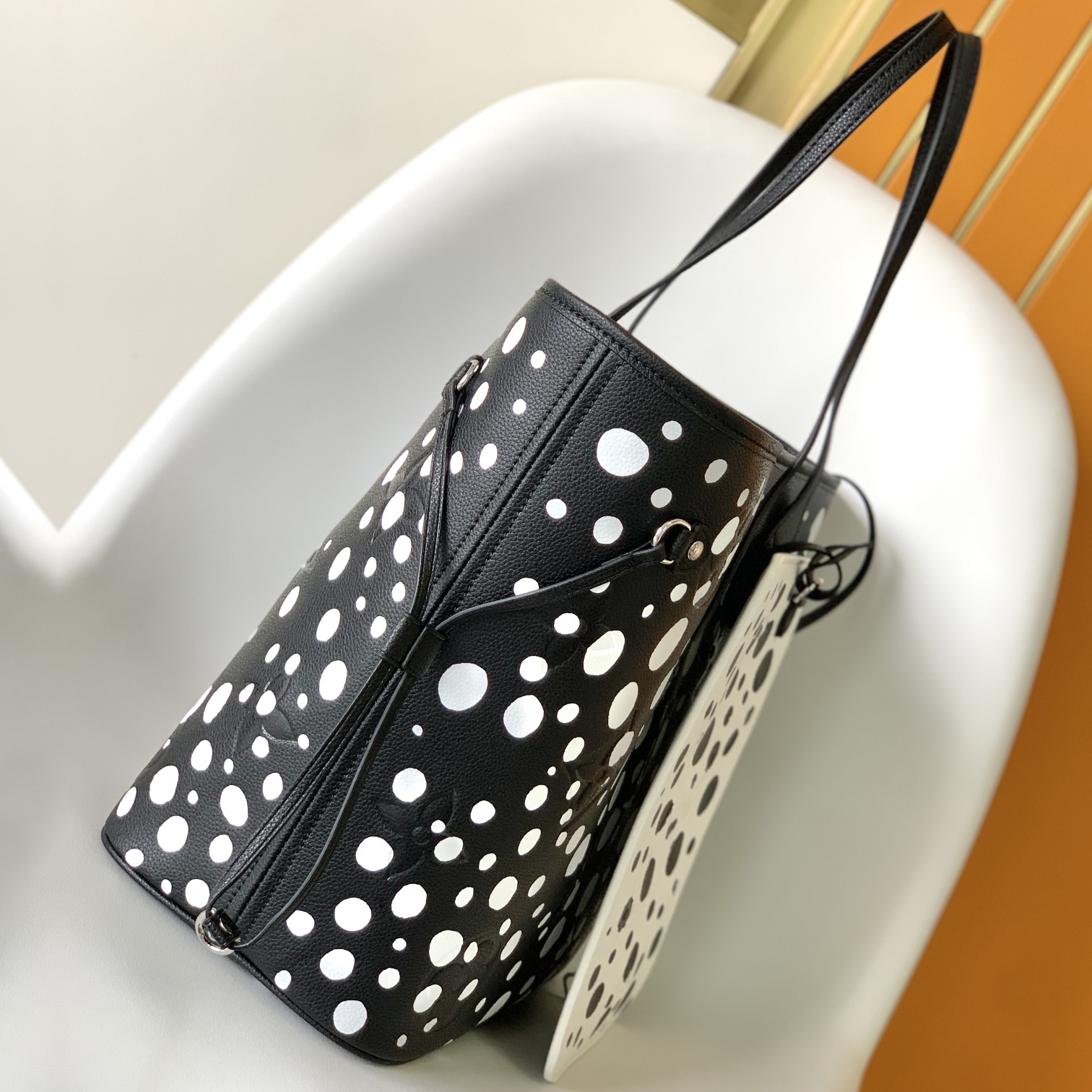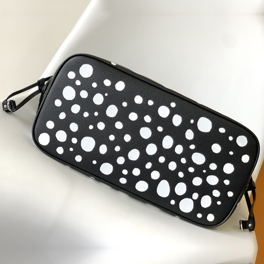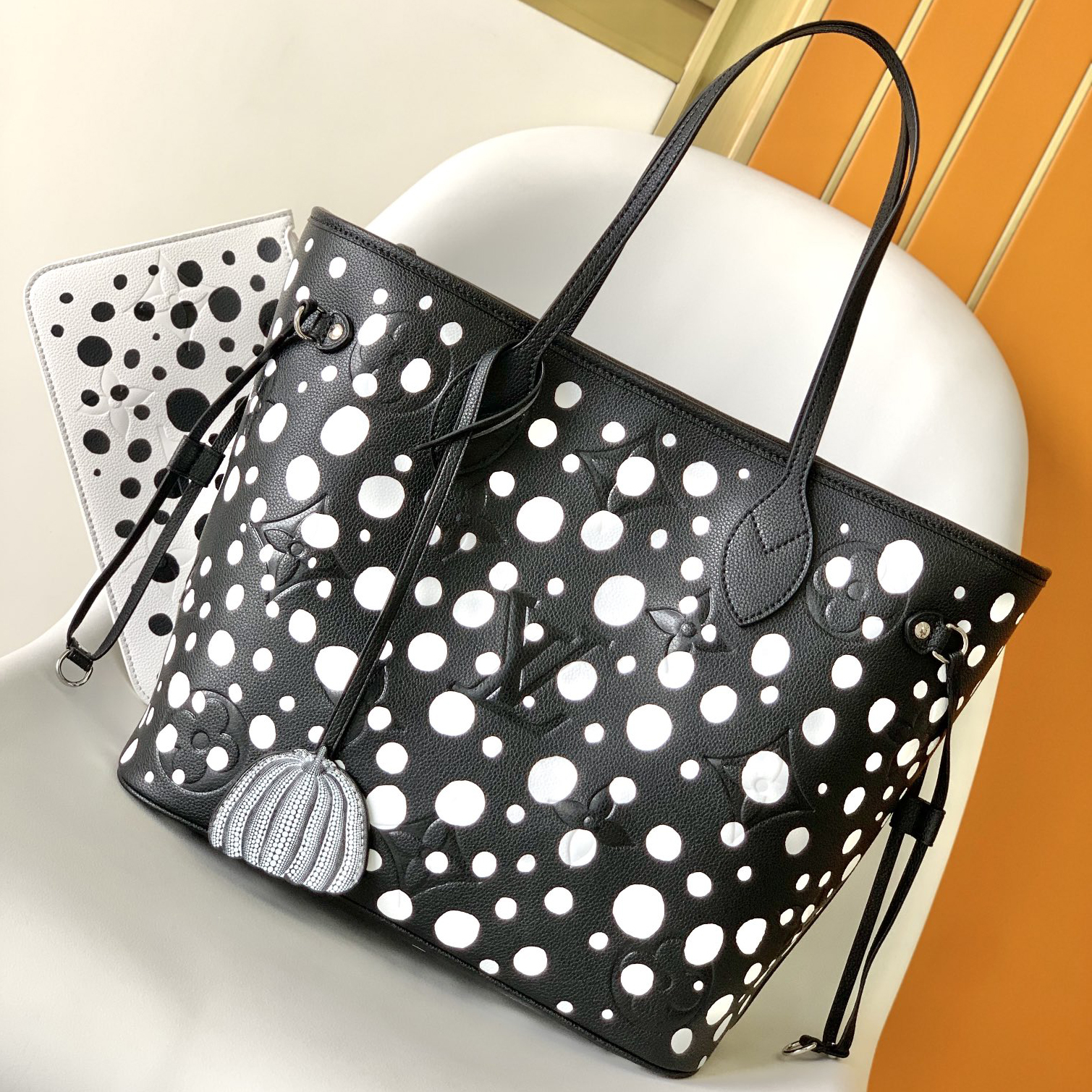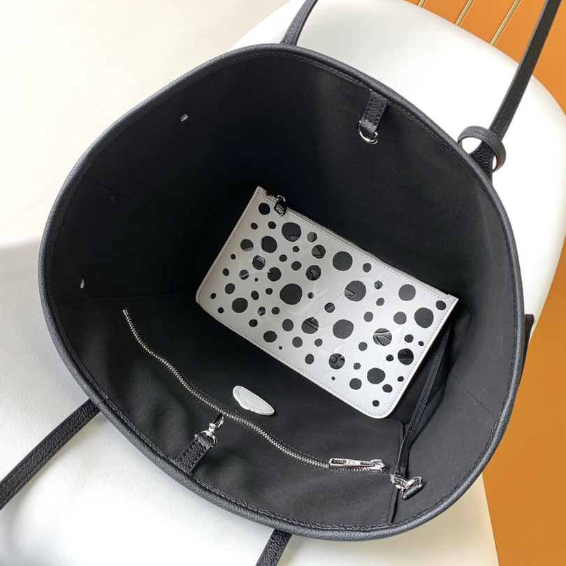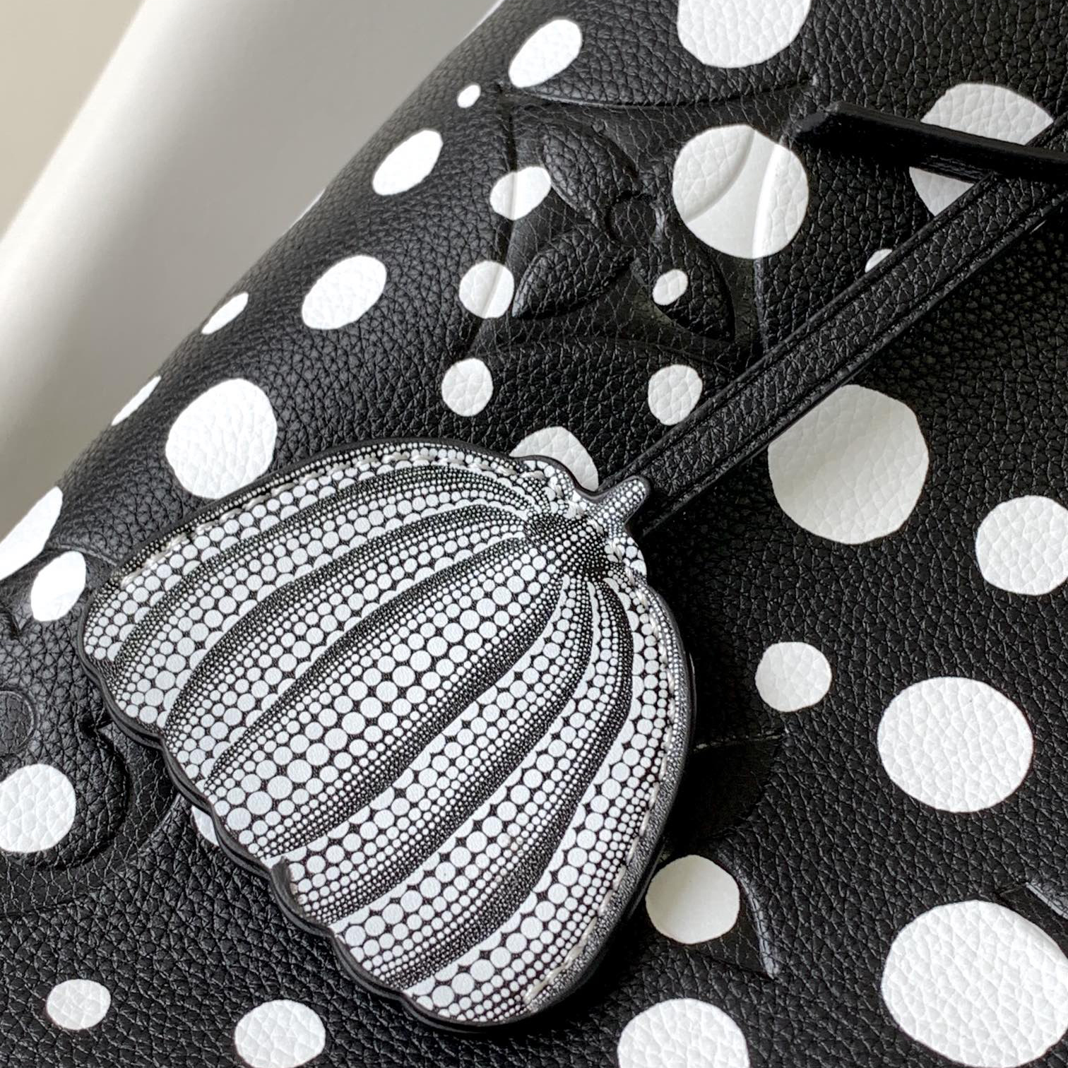 アートと上質なクラフツマンシップを讃える、「ルイ・ヴィトン × 草間彌生」コラボレーションの新作コレクションに相応しい「ネヴァーフル MM」。著名な日本人アーティスト 草間彌生は、無限を想わせるシンボルとして水玉模様を用いることで知られています。艶やかなブラックのモノグラム・アンプラント レザーに、ホワイトのドットをあしらいました。草間のもう1つのシグネチャーであるパンプキンを象ったチャームで彩り、取外し可能なポーチを配して機能性を高めたトートバッグです。