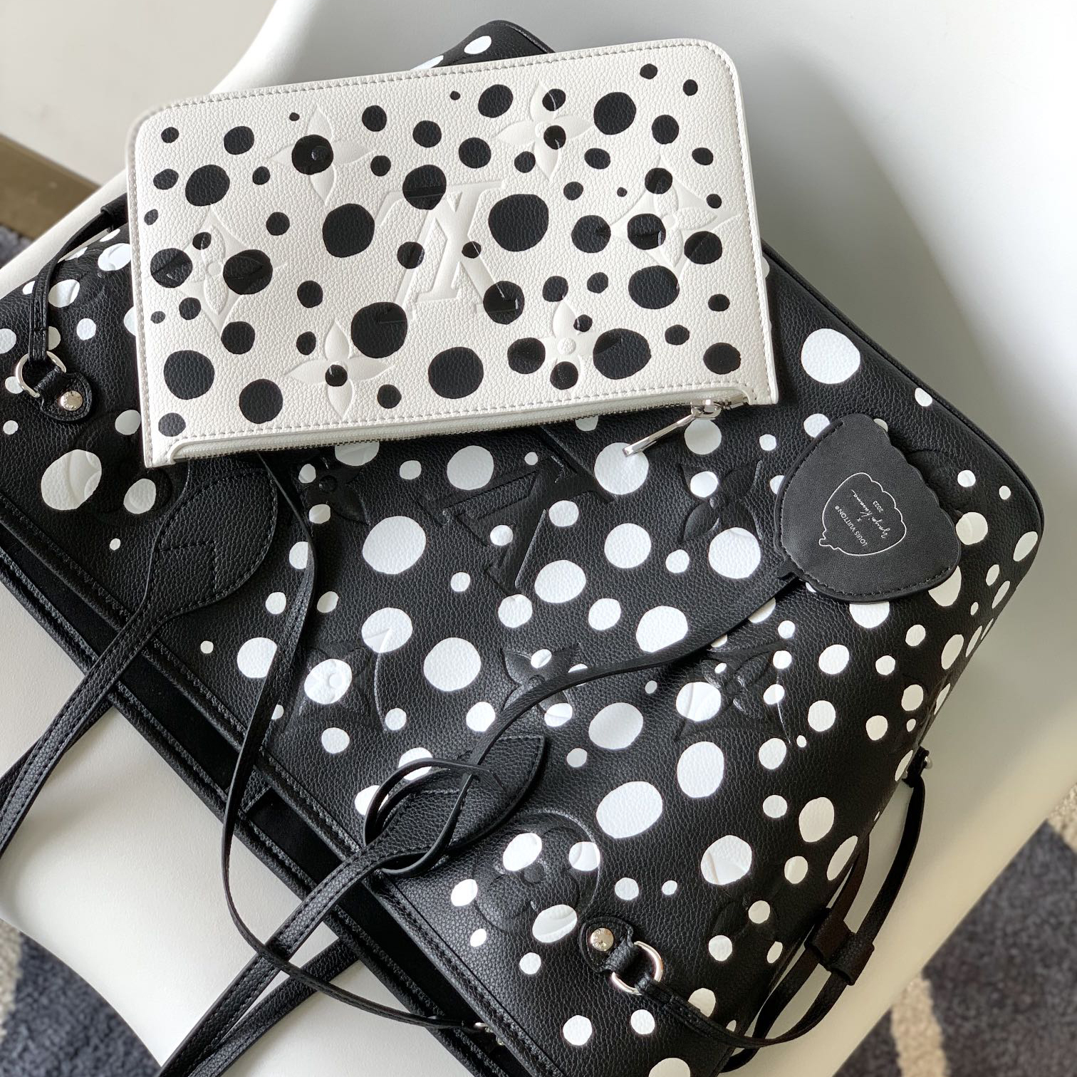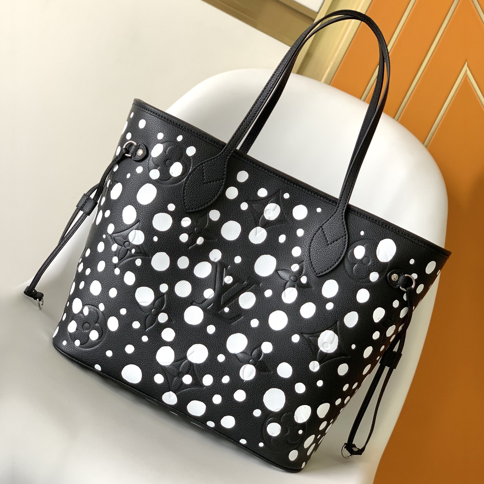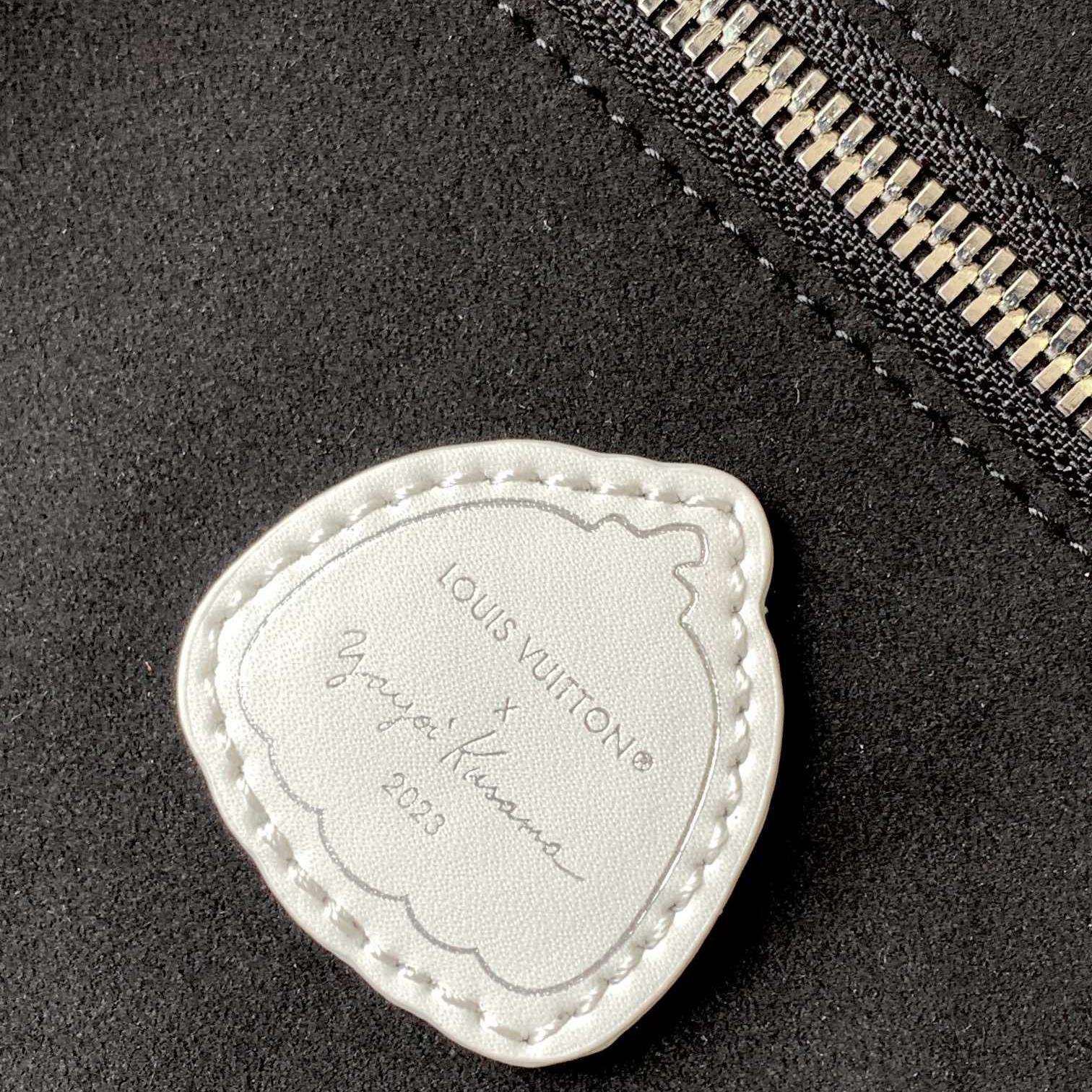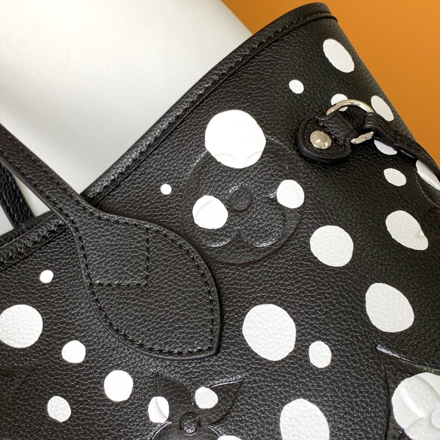 アートと上質なクラフツマンシップを讃える、「ルイ・ヴィトン × 草間彌生」コラボレーションの新作コレクションに相応しい「ネヴァーフル MM」。著名な日本人アーティスト 草間彌生は、無限を想わせるシンボルとして水玉模様を用いることで知られています。艶やかなブラックのモノグラム・アンプラント レザーに、ホワイトのドットをあしらいました。草間のもう1つのシグネチャーであるパンプキンを象ったチャームで彩り、取外し可能なポーチを配して機能性を高めたトートバッグです。