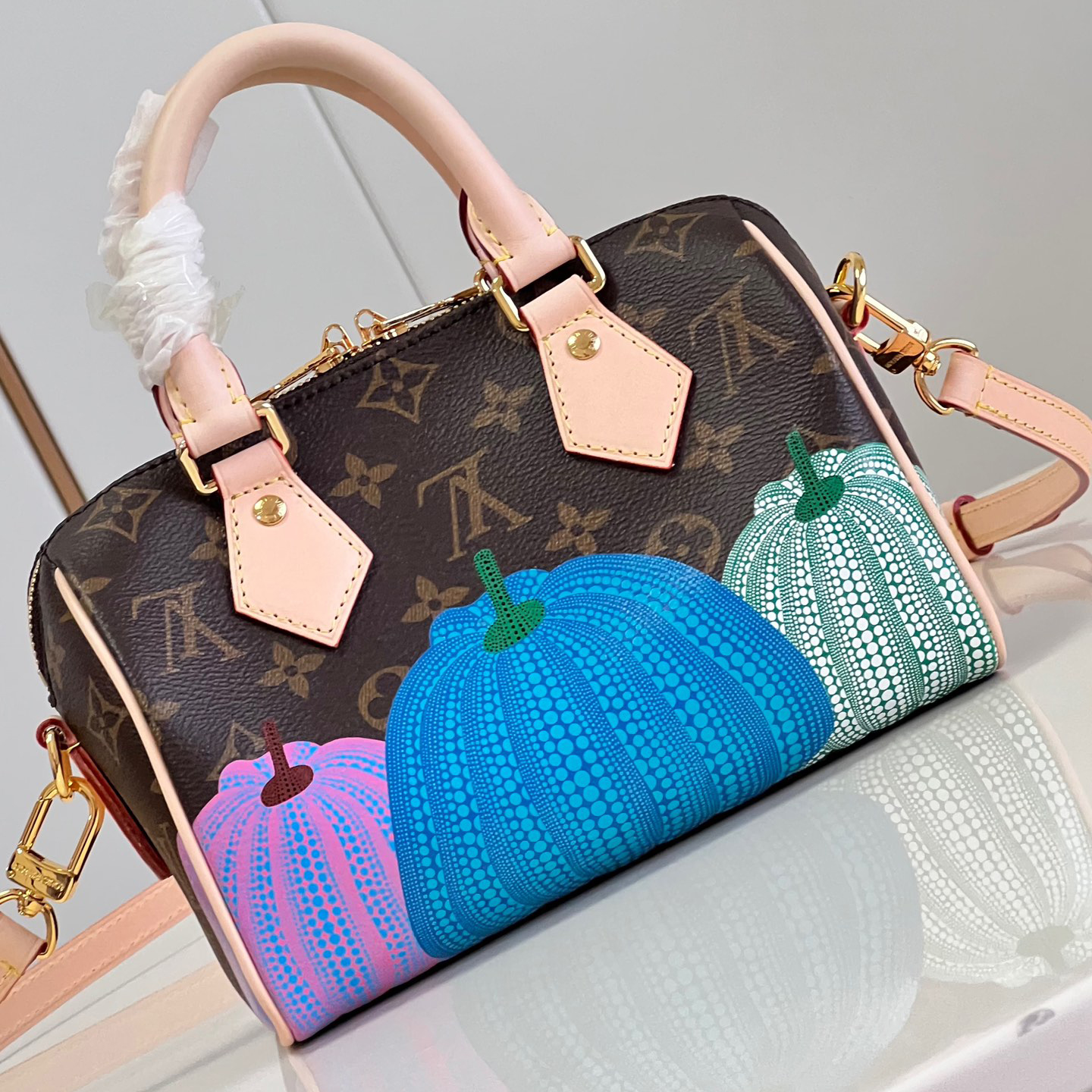 「ルイ・ヴィトン × 草間彌生」コラボレーションの新作コレクションに相応しく、「パンプキン」のテーマでアップデートした「LV × YK スピーディ・バンドリエール 20」。モノグラム・キャンバスに、エクスクルーシブな目を引くプリントがあしらわれています。メゾンのアイコニックな素材を、著名な日本人アーティスト 草間彌生が繰り返し用いてきたテーマである、サイケデリックに表現したカボチャを想わせるモチーフで彩りました。アーティスティックな表現で再解釈された、コンパクトで持ち運びしやすいバッグです。