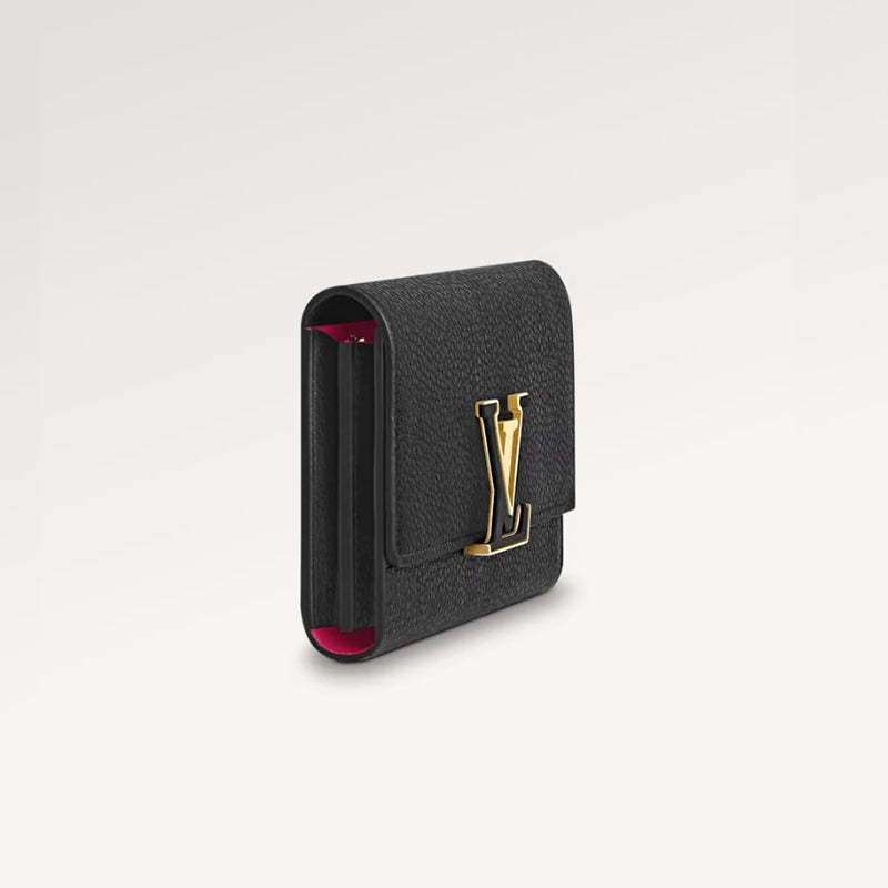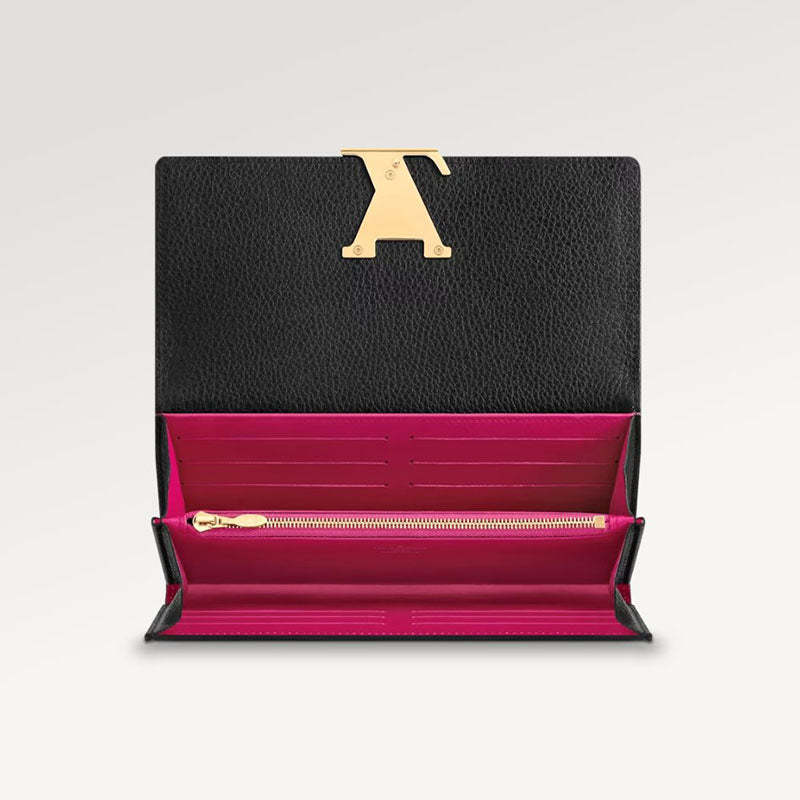 しなやかなトリヨンレザーを使用し、レザーコーティングが施されたLVシグネチャーをあしらった、「ポルトフォイユ・カプシーヌ」。メゾンを象徴する「カプシーヌ」のラインから着想を得たエレガントな財布です。美しさと機能性を兼ね備えたデザインは、日常の必需品を収納するのにも十分な大きさです。