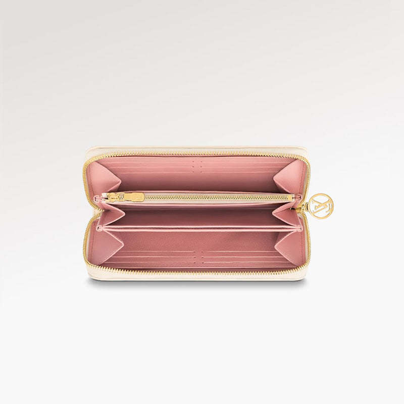 パフ感のあるラムレザーに、モノグラム・パターンをエンボス加工とプリントで施した「ジッピー・ウォレット」。フェミニンな色合いで仕立て、ゴールドカラーのファスナーで仕上げました。紙幣やコインなどの必需品を収納できる複数のマチ付きコンパートメント、ポケット、カードスロットを備えた、日常使いにぴったりの機能的な財布です。