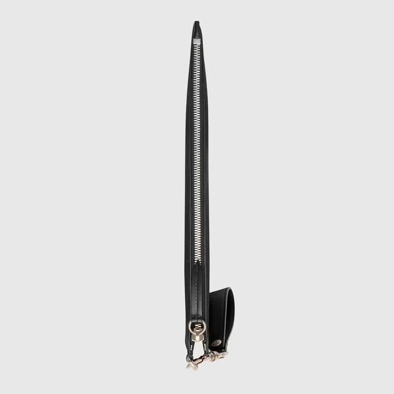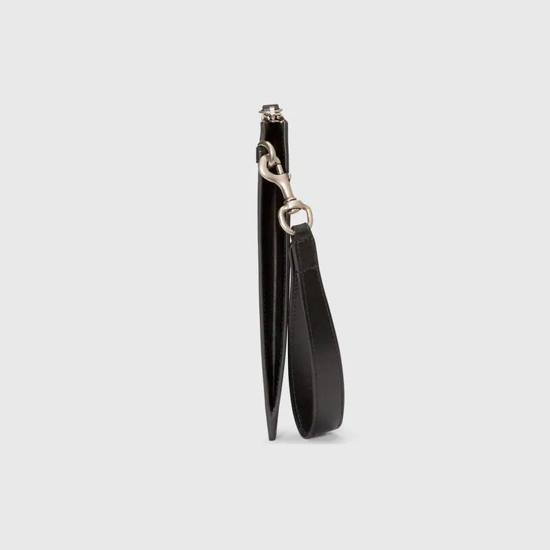 ブラック&グレーのGGスプリーム キャンバスで仕立てたポーチ。同系色のレザーでトリミングし、知性と権力を象徴するキングスネークのモチーフをあしらっています。