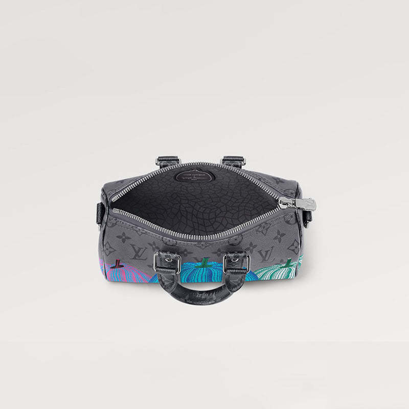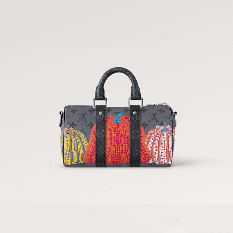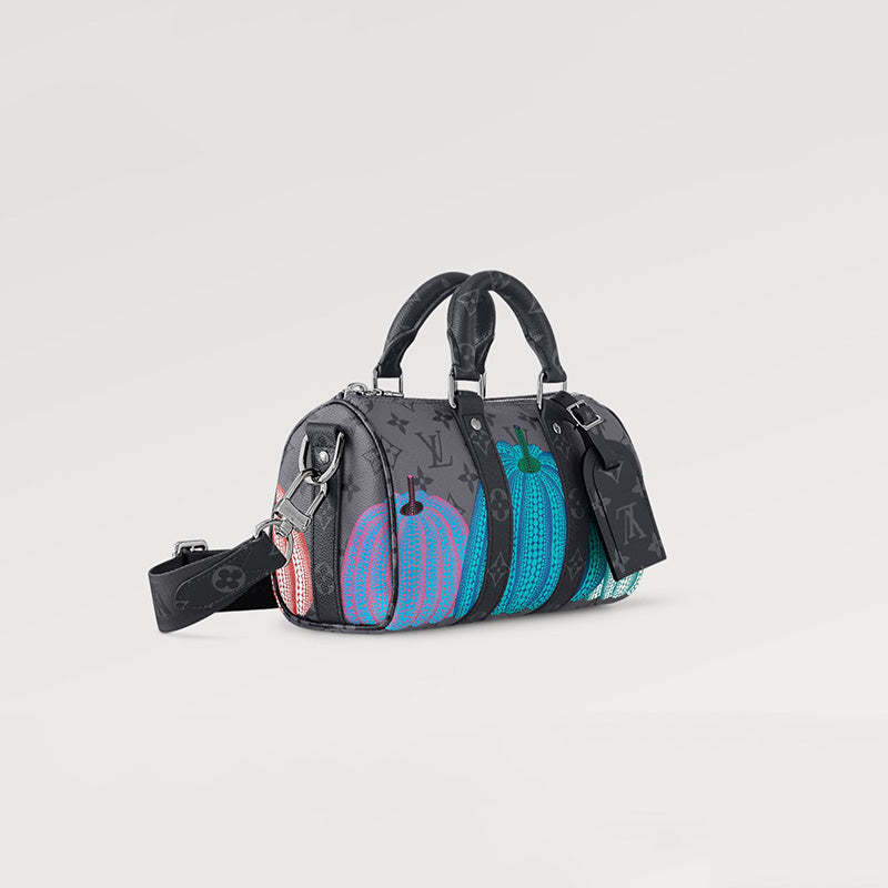 クラシカルなトラベルバッグを、「ルイ・ヴィトン × 草間彌生」コレクション第2弾に相応しく、小ぶりなサイズに再解釈した「LV × YK キーポル・バンドリエール 25」。遊び心溢れるフレッシュな個性が薫ります。草間の作品のメインテーマとなっている、温もりと楽観主義の象徴であるカボチャ──モノグラム・エクリプス リバース キャンバスに、カラフルな「パンプキン」のモチーフをプリントしました。世界的に著名なアーティスト 草間彌生とメゾンとの、緊密なパートナーシップにオマージュを捧げてデザインされた、目を引くアクセサリーです。