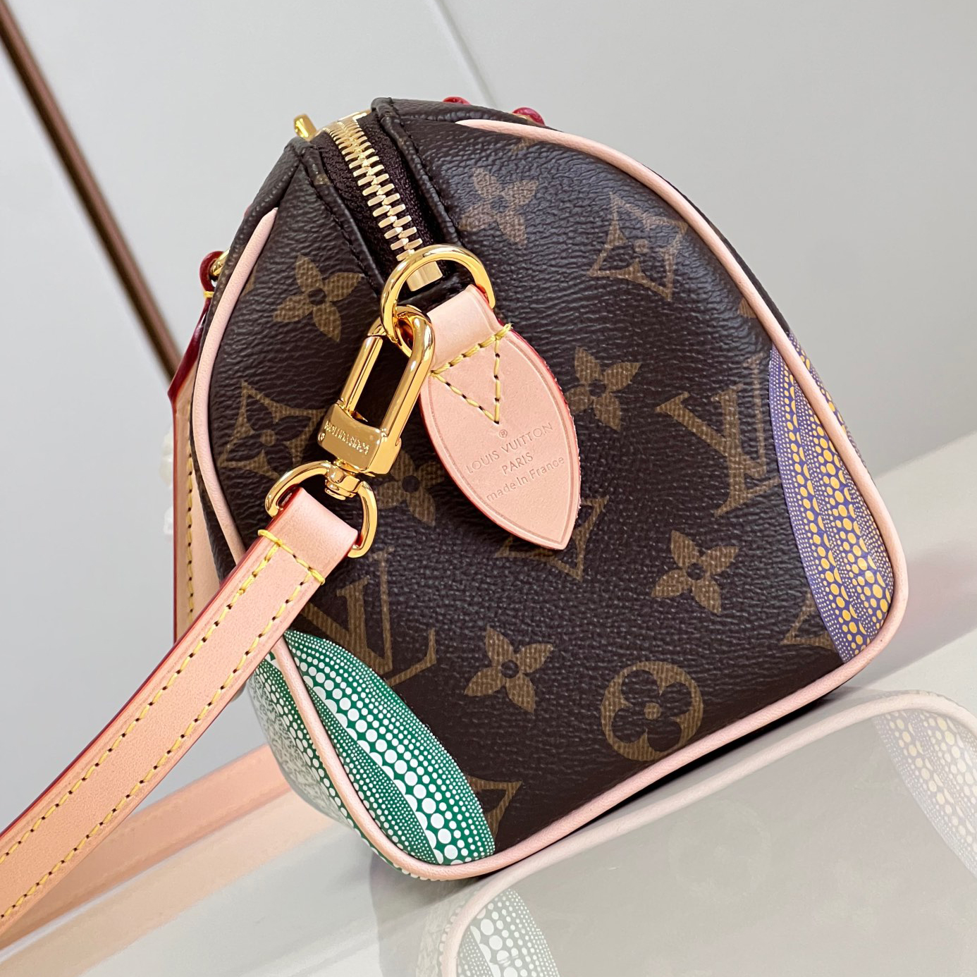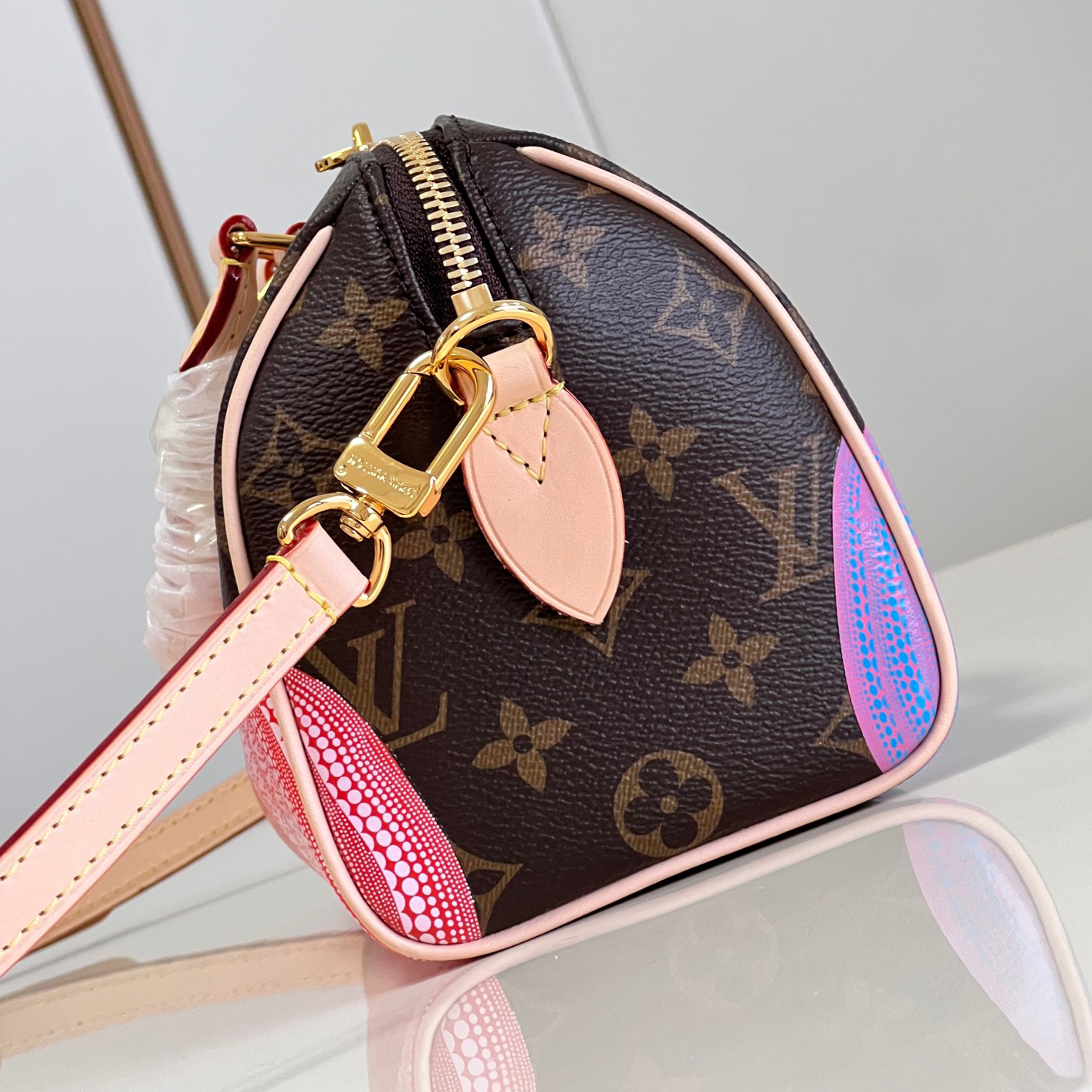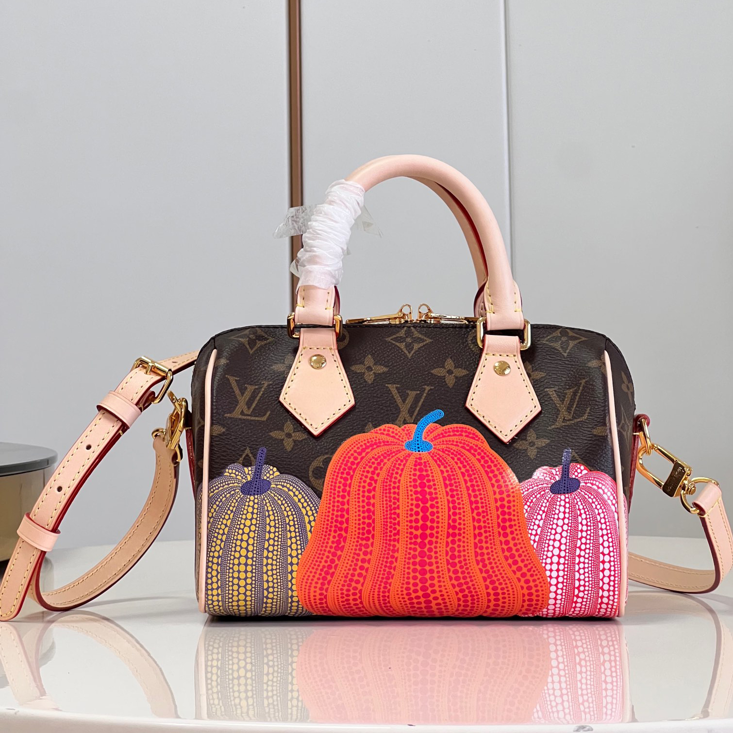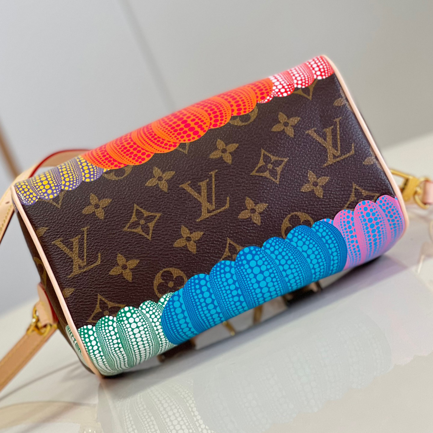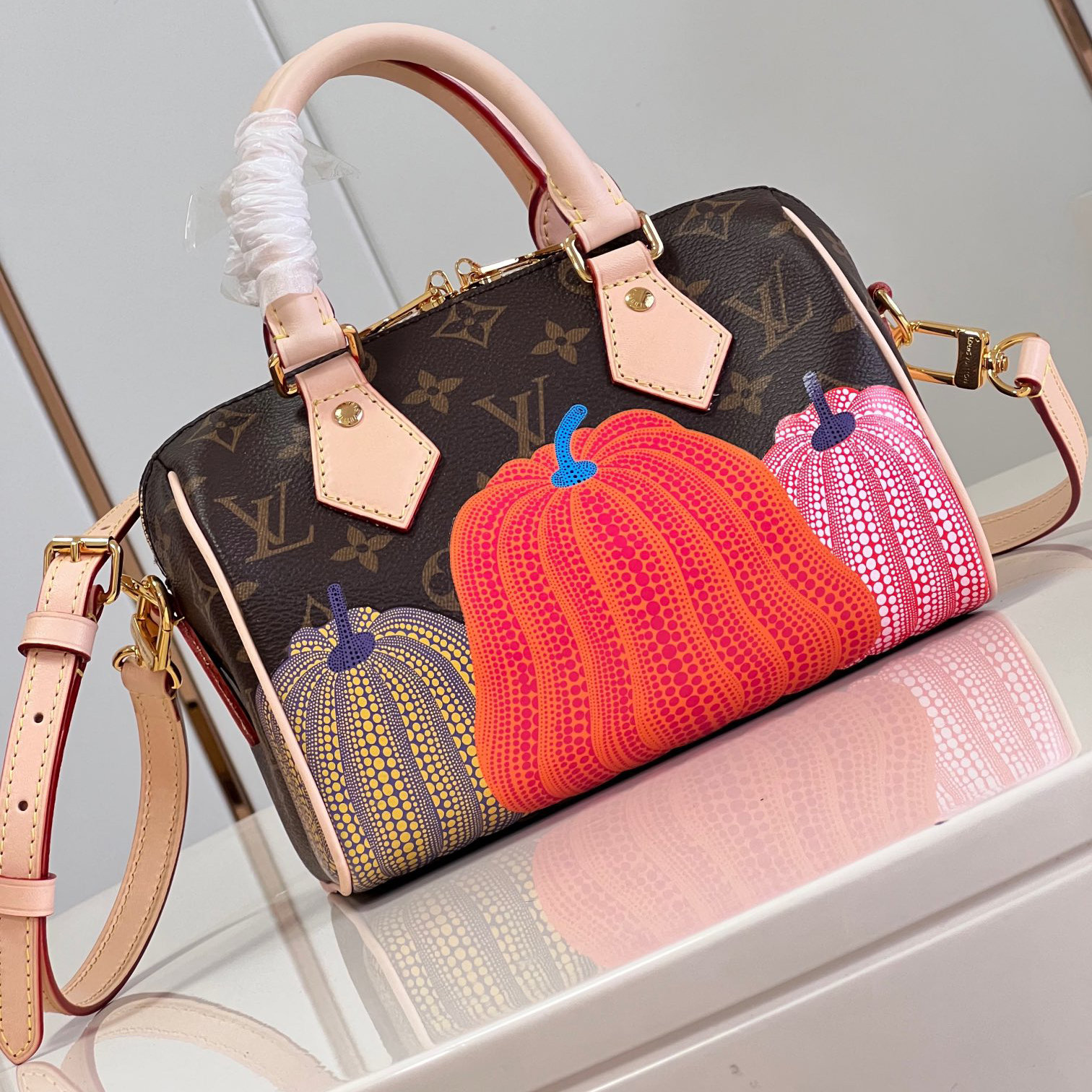 「ルイ・ヴィトン × 草間彌生」コラボレーションの新作コレクションに相応しく、「パンプキン」のテーマでアップデートした「LV × YK スピーディ・バンドリエール 20」。モノグラム・キャンバスに、エクスクルーシブな目を引くプリントがあしらわれています。メゾンのアイコニックな素材を、著名な日本人アーティスト 草間彌生が繰り返し用いてきたテーマである、サイケデリックに表現したカボチャを想わせるモチーフで彩りました。アーティスティックな表現で再解釈された、コンパクトで持ち運びしやすいバッグです。